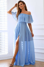 Tandis que son encolure bardot apporte un esprit résolument champêtre à la pièce, sa coupe longue et sa taille empire structurent la silhouette en toute facilité.