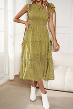 Cette robe fleurie marque également une allure pleine de féminité. Son haut smocké et ses manches courtes volantées donnent un esprit résolument romantique à cette robe de demoiselle d'honneur.