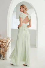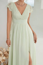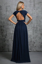 Le haut en dentelle délicate, associé à une taille empire marquée, structure la ligne avec justesse. Le dos nu vient apporter une touche sensuelle tout en retenue, tandis que la jupe fendue dévoile la jambe avec grâce à chaque pas. Une pièce idéale pour les cérémonies d’été ou les mariages en plein air.
