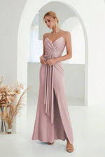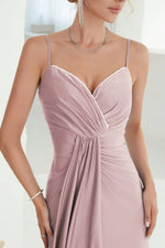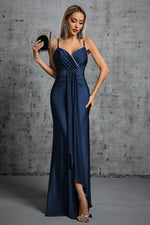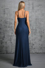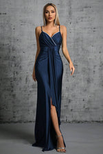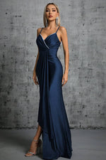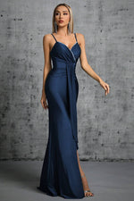 Le dos nu fluide, retenu par de fines bretelles, crée un jeu de lignes délicat dans le dos. À l’avant, un décolleté croisé façon cache-cœur, discrètement orné, apporte structure et féminité. La fente frontale allonge la jambe avec subtilité, parfaite pour danser jusqu’au bout de la nuit.