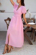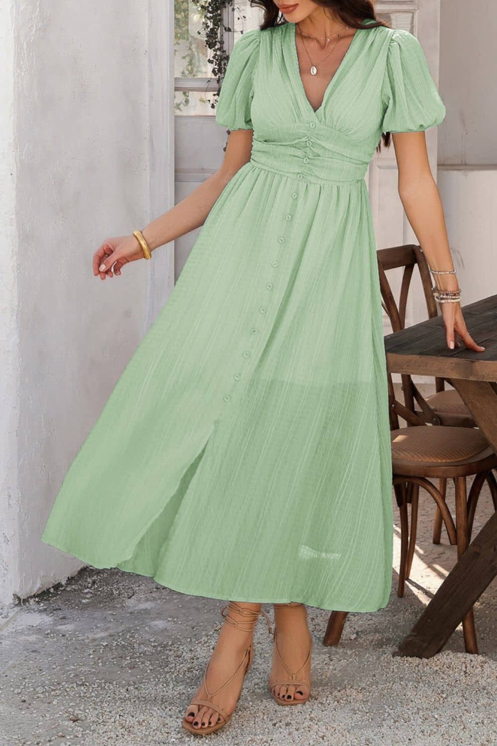 Déclinée en vert sauge ou en rose, cette robe longue manches bouffantes sera votre alliée idéale pour un mariage champêtre, une garden party ou un brunch élégant. Associez-la à des sandales fines et des bijoux dorés pour révéler toute la poésie de votre style.