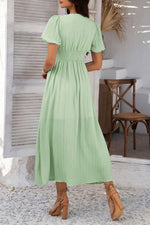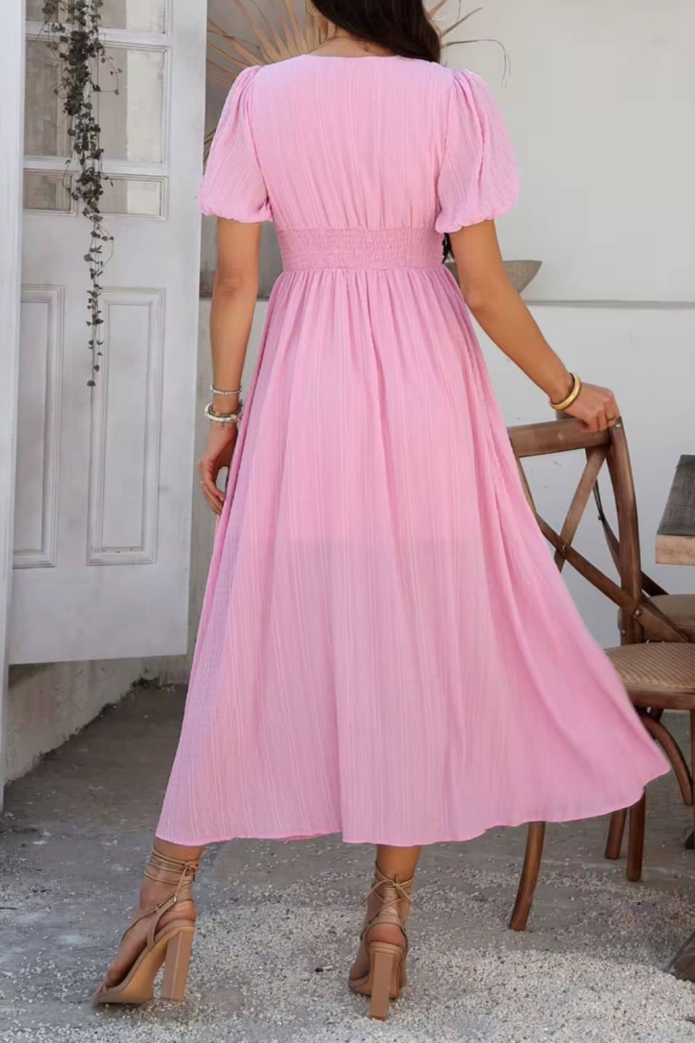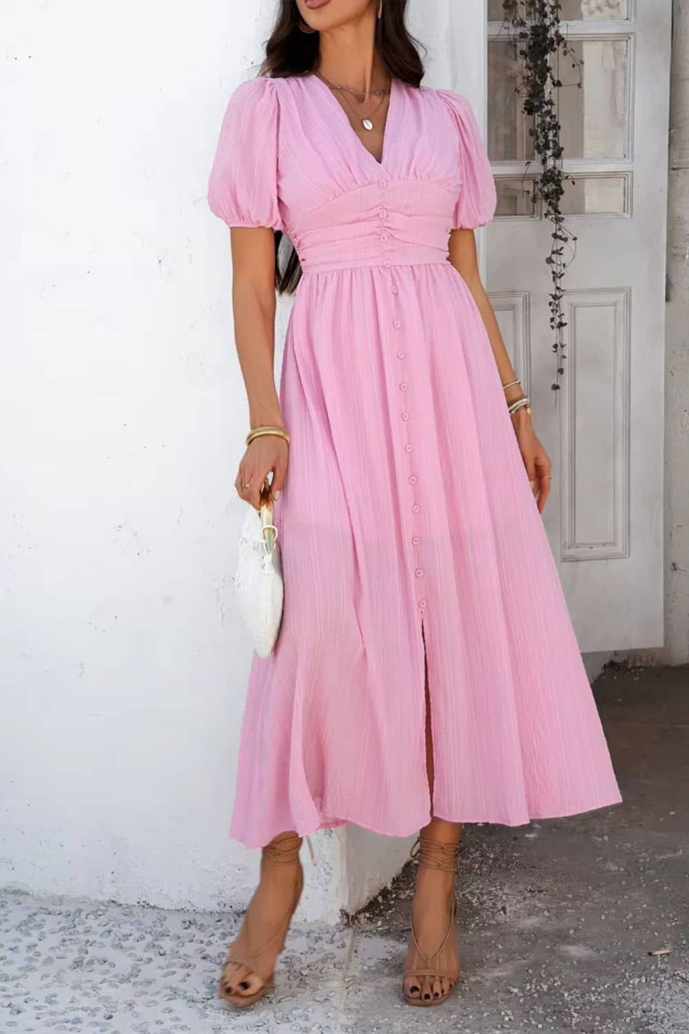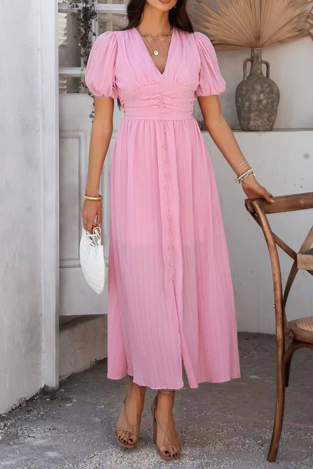 Ses manches courtes bouffantes, apportent juste ce qu’il faut de romantisme champêtre. Le détail du boutonnage décoratif et l'encolure en V mettent joliment en valeur la silhouette, tandis que la texture légère du tissu promet une allure aérienne et naturelle.