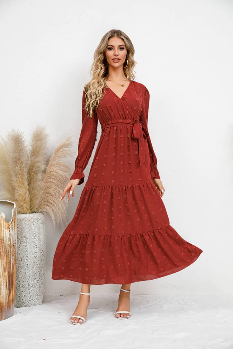 En proposant un coloris orange brûlé et burgundy, cette robe champêtre chic couleur automne épouse cette saison en te garantissant un look romantique parfaitement adapté.