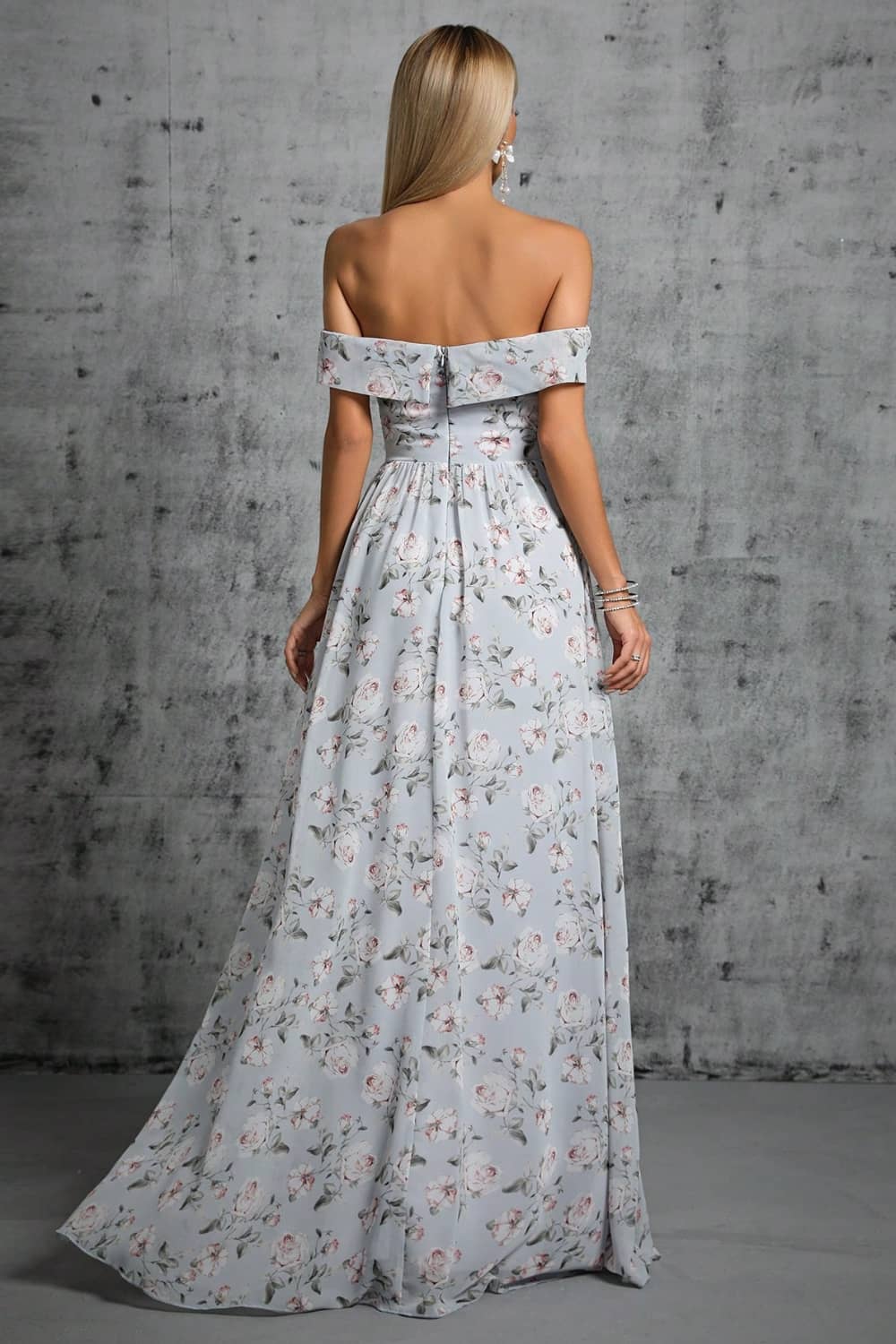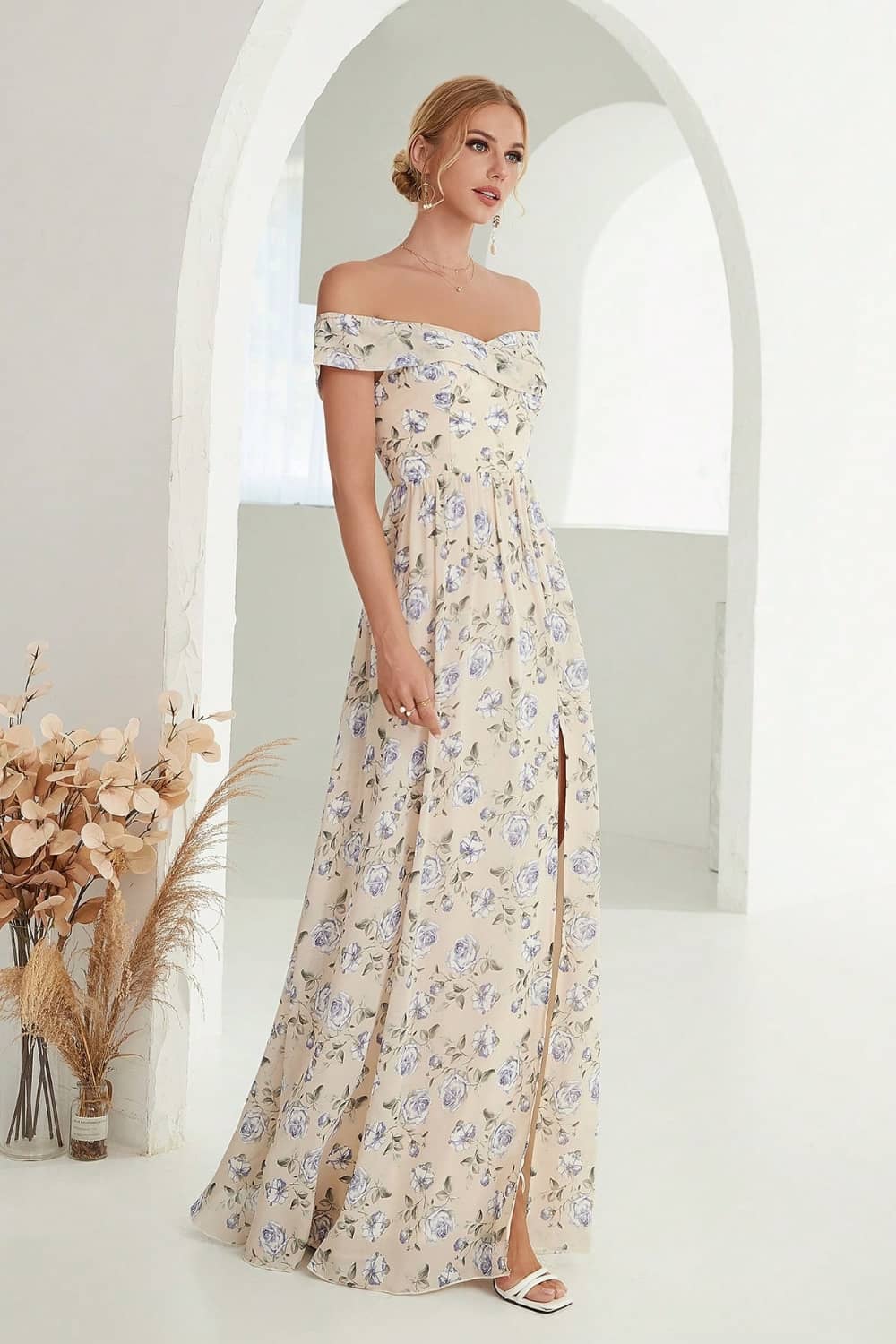 L’imprimé fleuri, à la fois raffiné et parfaitement romantique, ajoute une touche bucolique idéale pour les célébrations en plein air. La taille haute vient ensuite structurer la silhouette, et le dos nu complète le tout avec féminité.