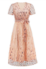 Si cette robe de cérémonie admet un style aussi chic, c'est aussi grâce à sa broderie fleurie. À cela s'ajoute un coloris rose poudré et bleu marine qui illustrent totalement l'esprit champêtre par leur douceur et leur naturel.